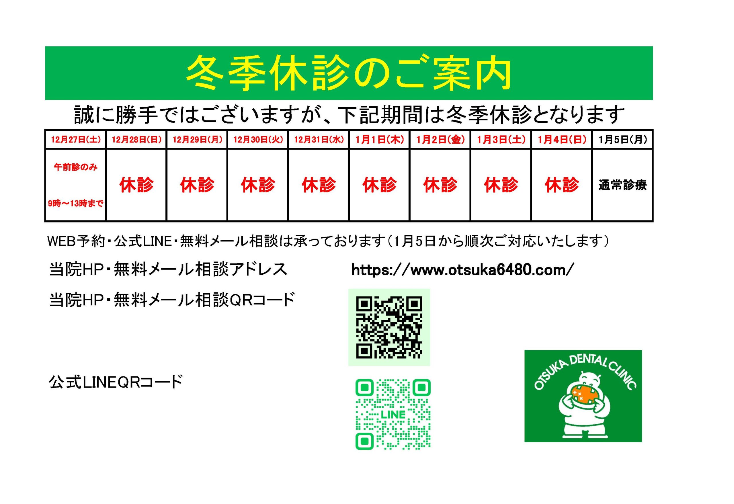 当院は12月28日(日)~1月4日(日)の間冬季休診でございます。12月27日(土)は午前診(9時~13時)のみ行っております。なお、WEB予約・無料メール相談とLINE相談は受付しておりますのでご相談ください。なお、受け付けた内容は1月5日より順次対応させていただきます。