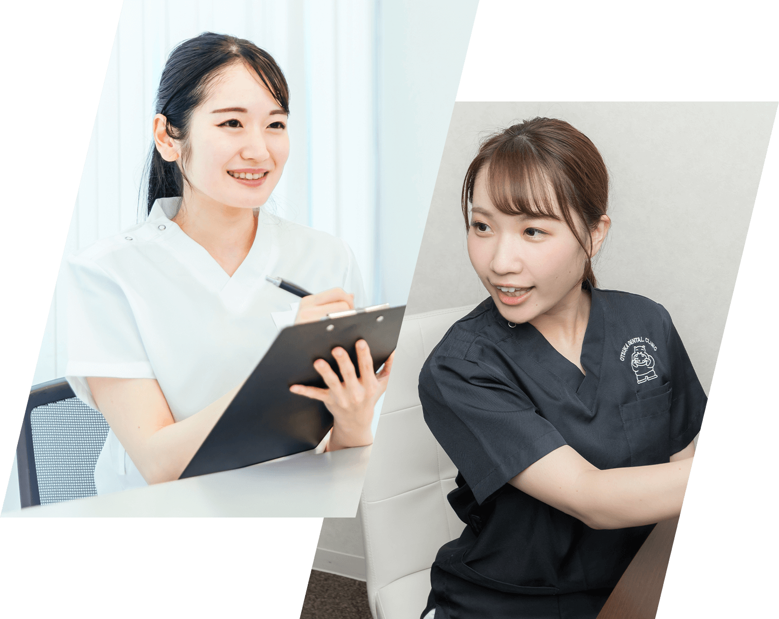 当院ではトリートメントコーディネーターという協会認定の専門資格を有した専任の歯科助手が、歯科医師と患者さまをつなぐ 役割として、一人一人の患者さまに担当させて頂いております。 トリートメントコーディネーターが間に入ることで患者さまは直接、歯科医師に聞きにくいこともご相談できます。 初診のカウンセリング時、治療中にご不満点やご不安な点があればいつでもトリートメントコーディネーターにご相談ができます。